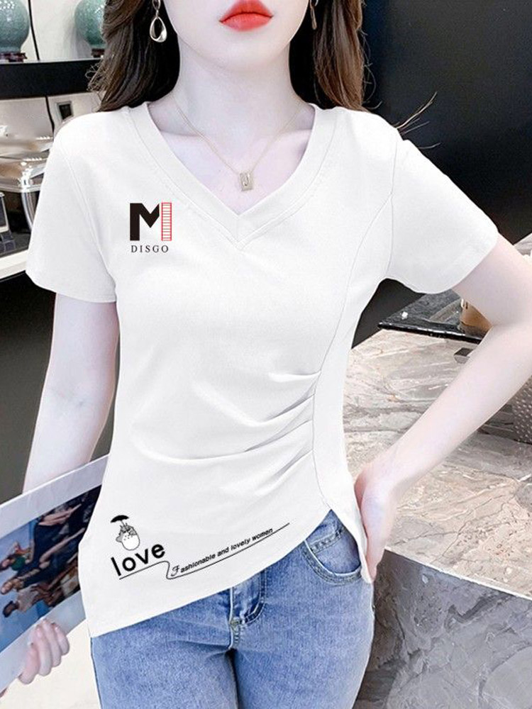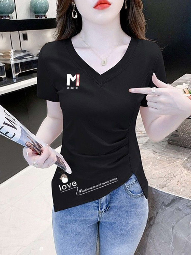 • 商品名称:纯棉短袖V领t恤女夏季2024年新款时尚小衫不规则修身上衣女设计感