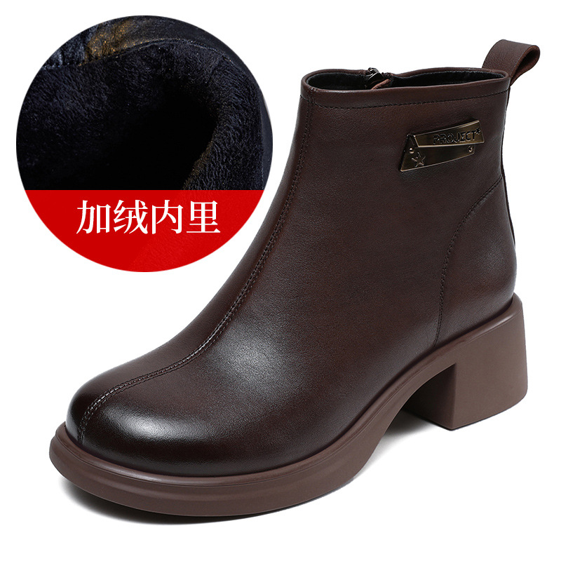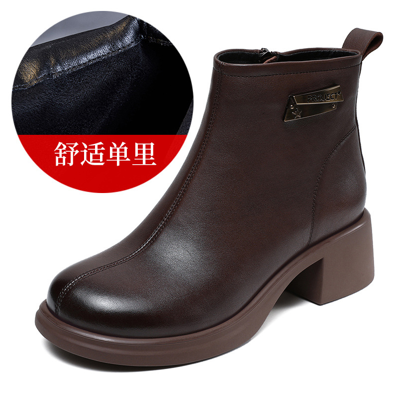 • 商品名称:瘦瘦短靴女2025秋冬新款软牛皮中跟时装单靴圆头粗跟加绒真皮靴子