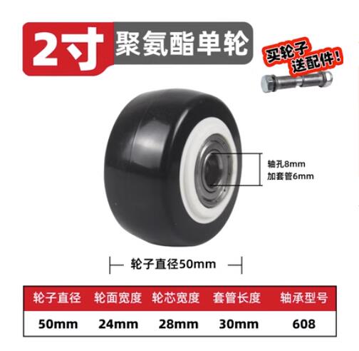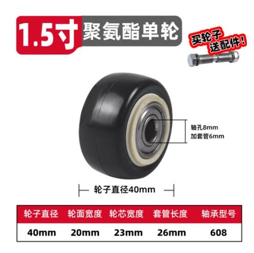 产品描述: 材质: 聚氨酯颜色分类: 1.5寸黑单轮 2寸黑单轮 2.5寸黑单轮 3寸黑单轮 4寸黑单轮 5寸黑单轮 6寸黑单轮 8寸黑单轮 1.5寸灰橡胶单轮 2寸灰橡胶单轮 1.5寸红聚氨酯单轮 2寸红聚氨酯单轮 2.5寸红聚氨酯单轮 3寸红聚氨酯单轮 4寸红聚氨酯单轮 5寸红聚氨酯单轮