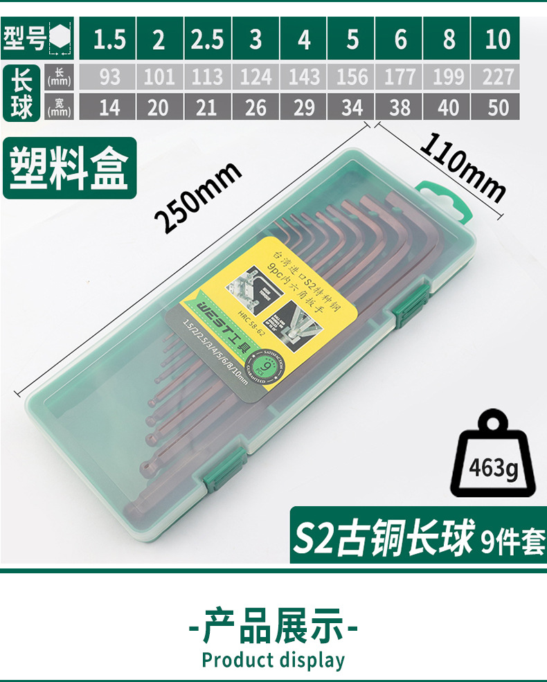 • 商品名称:威豪S2合金钢古铜色球头特长内六角扳手套装塑料盒9件套装五金工具