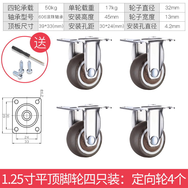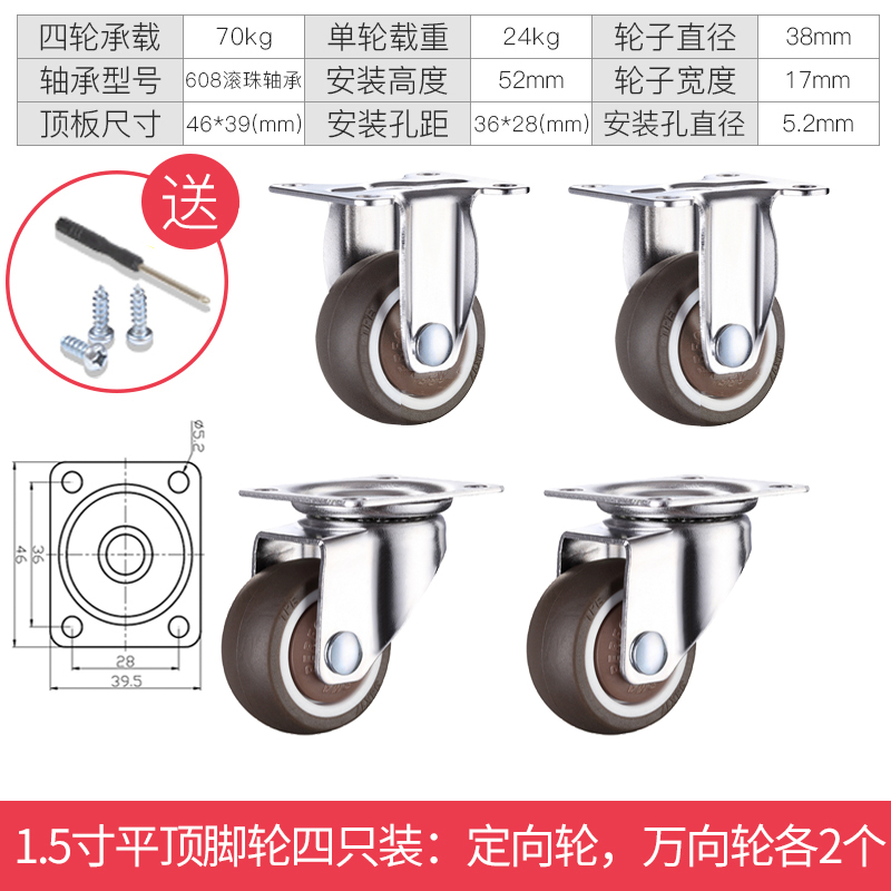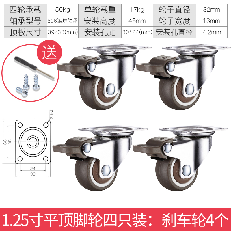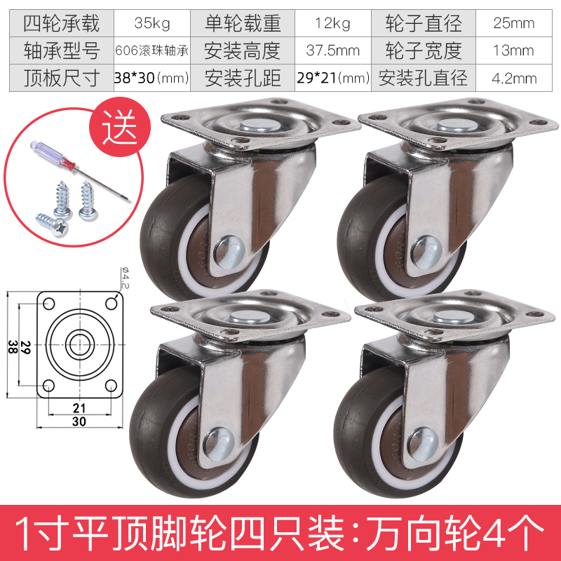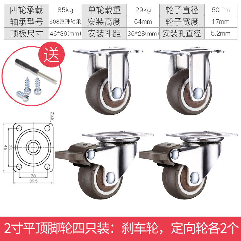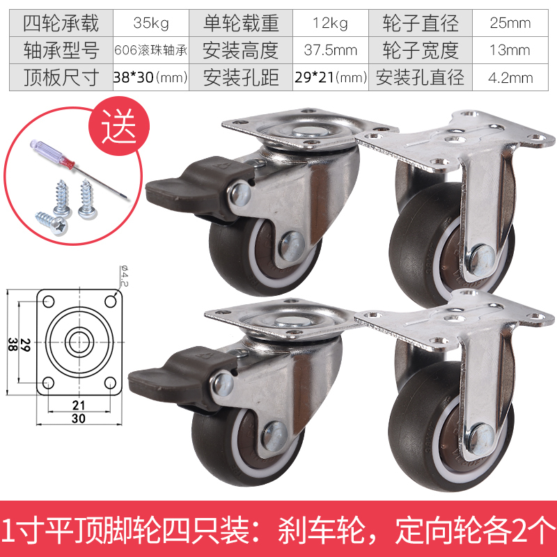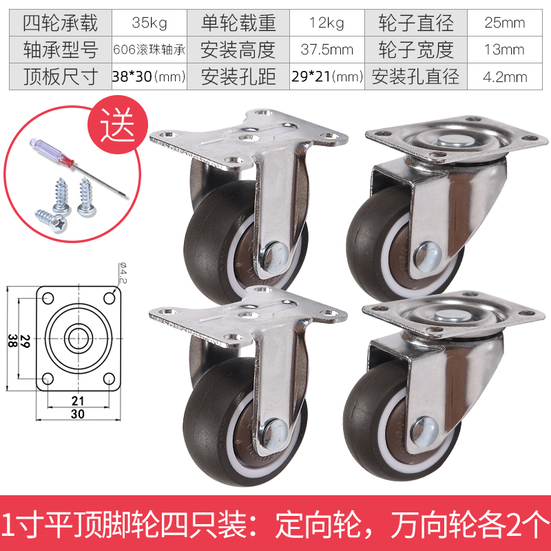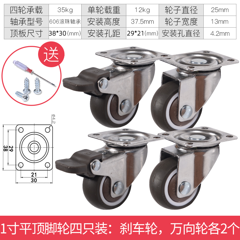 - 颜色分类: 1寸定向轮4个 1寸万向轮4个 1寸刹车轮4个 1寸(定向轮+万向轮)各2个 1寸(定向轮+刹车轮)各2个 1寸(万向轮+刹车轮)各2个 1.25寸定向轮4个 1.25寸万向轮4个 1.25寸刹车轮4个 1.25寸(定向轮+万向轮)各2个 1.25寸(定向轮+刹车轮)各2个 1.25寸(万向轮+刹车轮)各2个 1.5寸定向轮4个 1.5寸万向轮4个 1.5寸刹车轮4个 1.5寸(定向轮+万向轮)各2个 1.5寸(定向轮+刹车轮)各2个 1.5寸(万向轮+刹车轮)各2个 2寸定向轮4个 2寸万向轮4个 2寸刹车轮4个 2寸(定向轮+万向轮)各2个 2寸(定向轮+刹车轮)各2个 2寸(万向轮+刹车轮)各2个